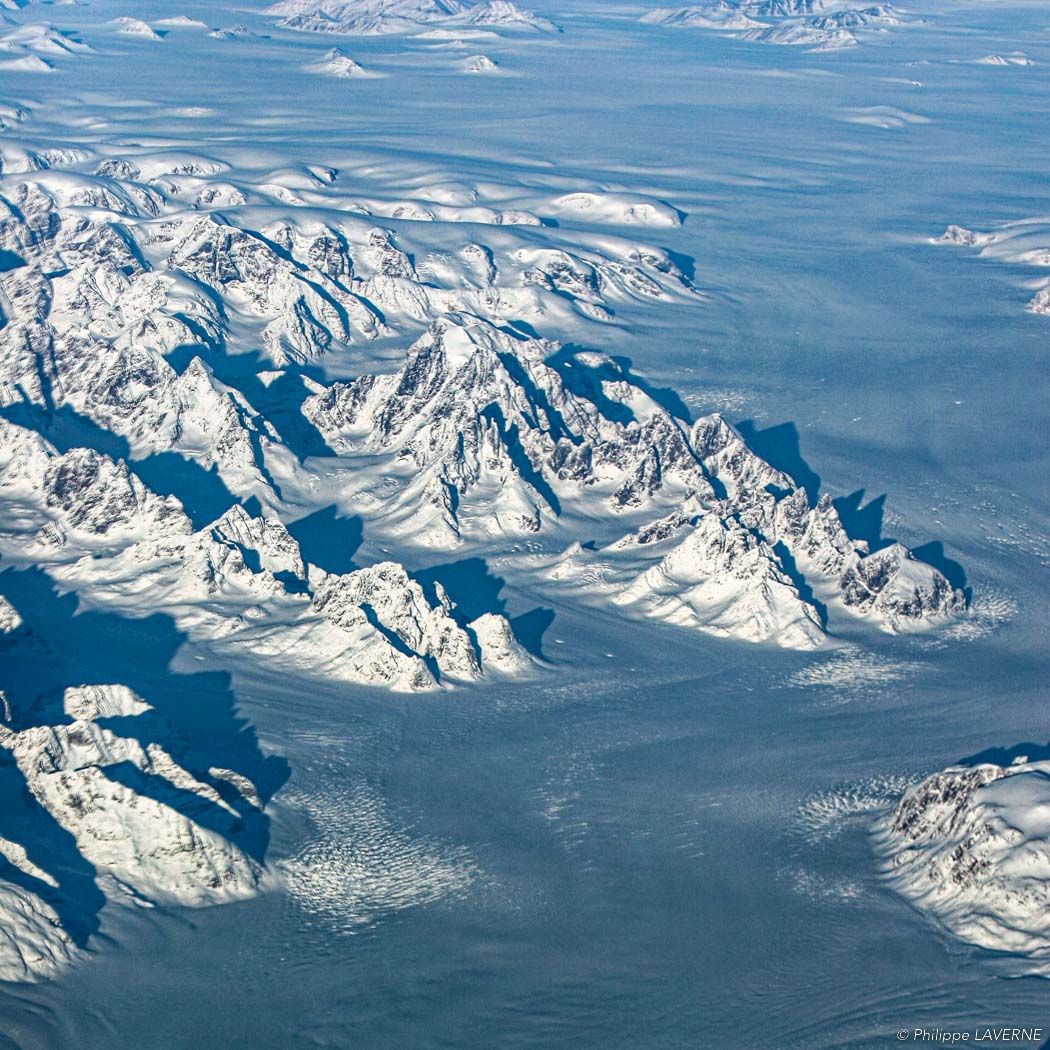 Avant d’aborder la partie uniforme recouverte d’une énorme épaisseur de glace, un paysage de montagne s’offre à nous avec de beaux glaciers. Voici deux photos du même endroit, l’une prise en février 2006, l’autre en novembre 2014.