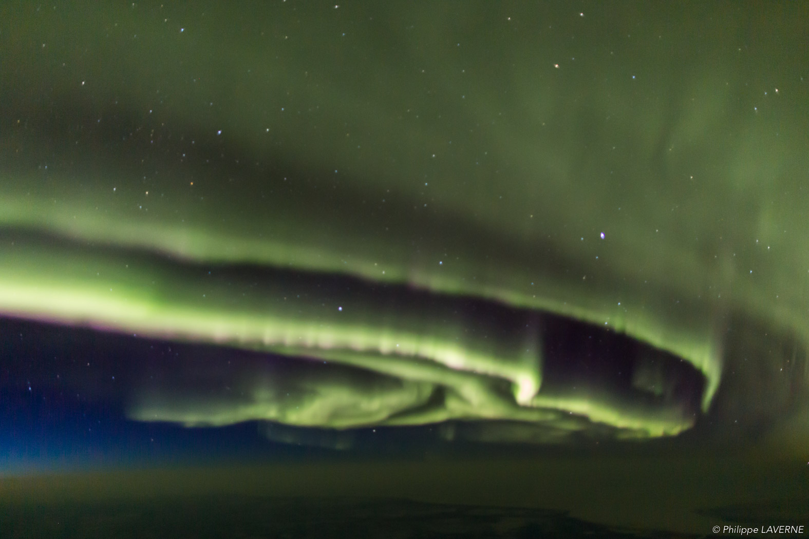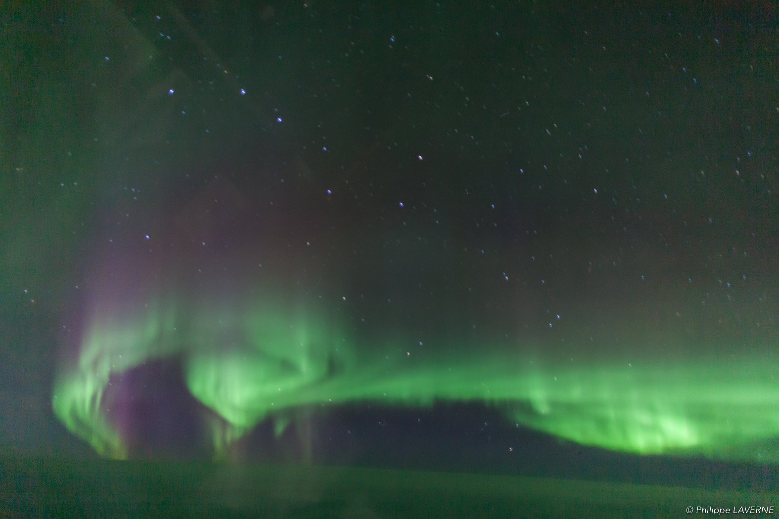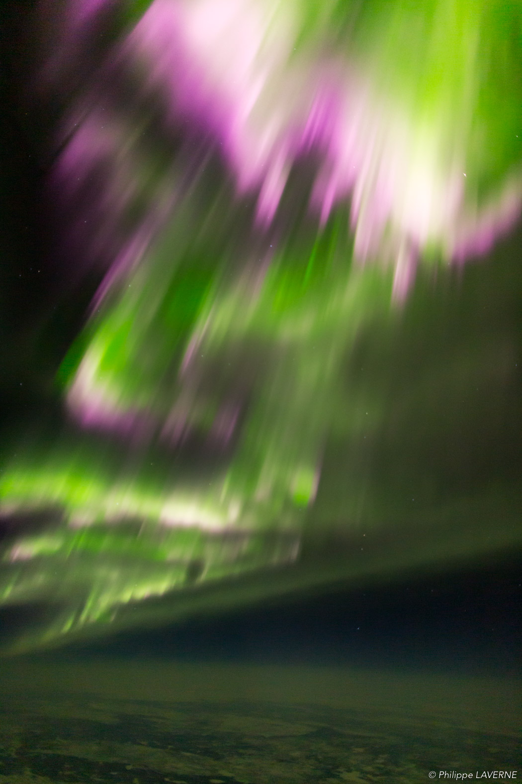 Certaines particules, après avoir été déviées, reviennent vers le pôle magnétique où elles entrent en collision avec les atomes composant la haute atmosphère. Ces collisions émettent des photons qui créent des voiles de lumières aux dominantes vertes : les aurores boréales.