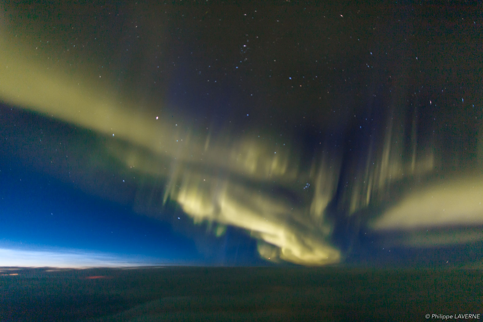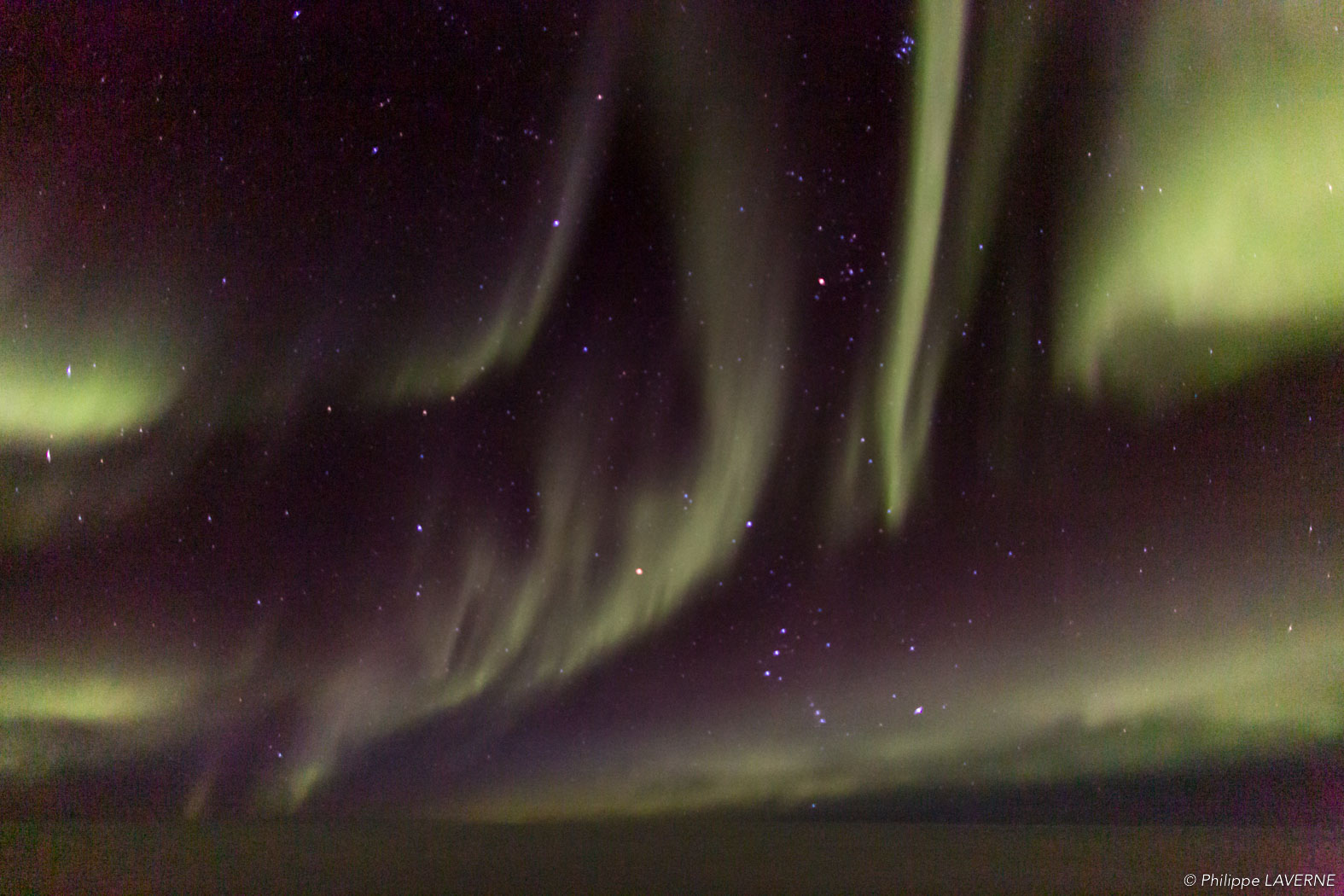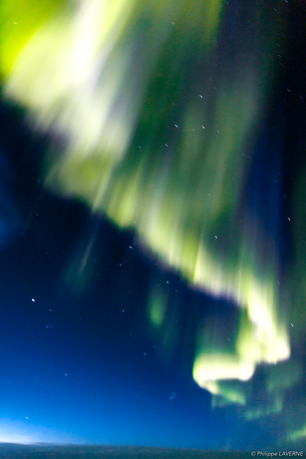 Certaines particules, après avoir été déviées, reviennent vers le pôle magnétique où elles entrent en collision avec les atomes composant la haute atmosphère. Ces collisions émettent des photons qui créent des voiles de lumières aux dominantes vertes : les aurores boréales.